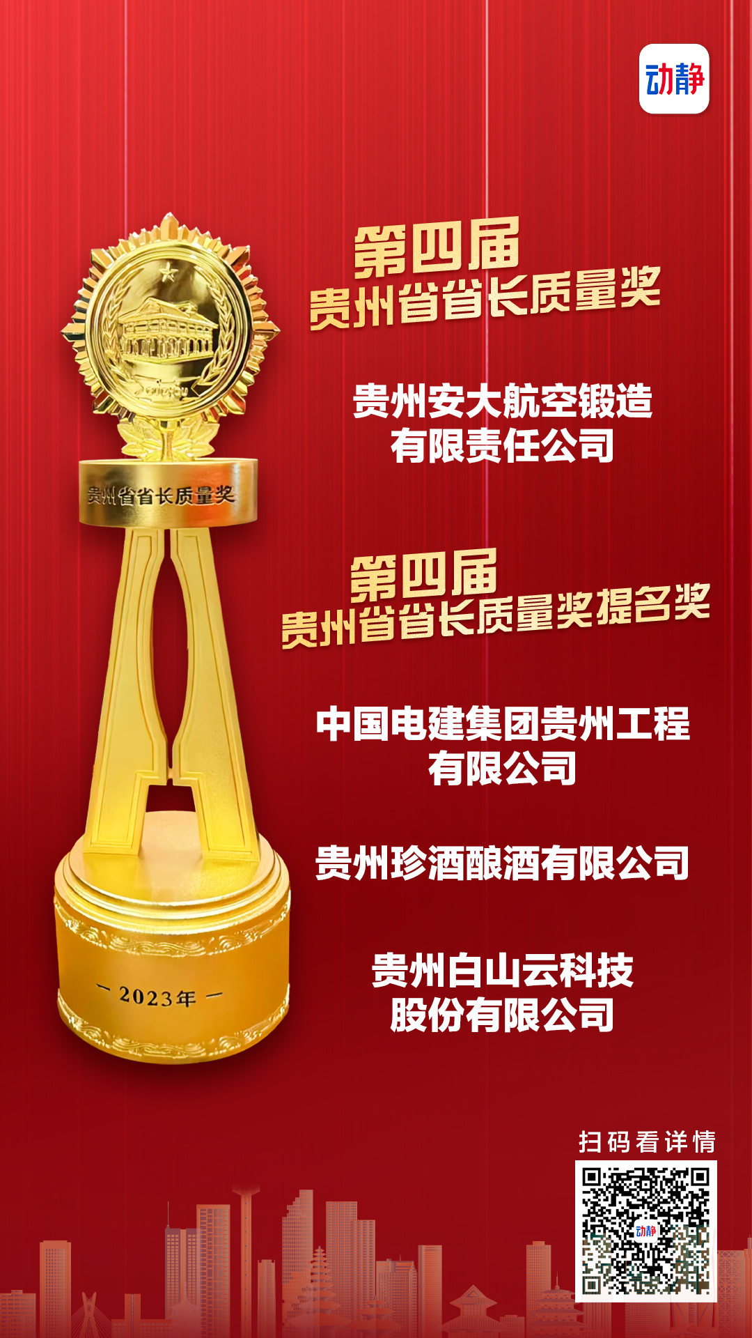 今天上午,2023年贵州省质量发展大会在贵阳举行。根据《贵州省省长质量奖管理办法(试行)》,决定授予贵州安大航空锻造有限责任公司第四届贵州省省长质量奖,授予中国电建集团贵州工程有限公司、贵州珍酒酿酒有限公司、贵州白山云科技股份有限公司第四届贵州省省长质量奖提名奖。