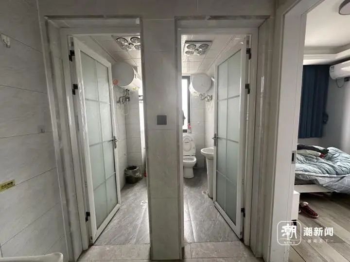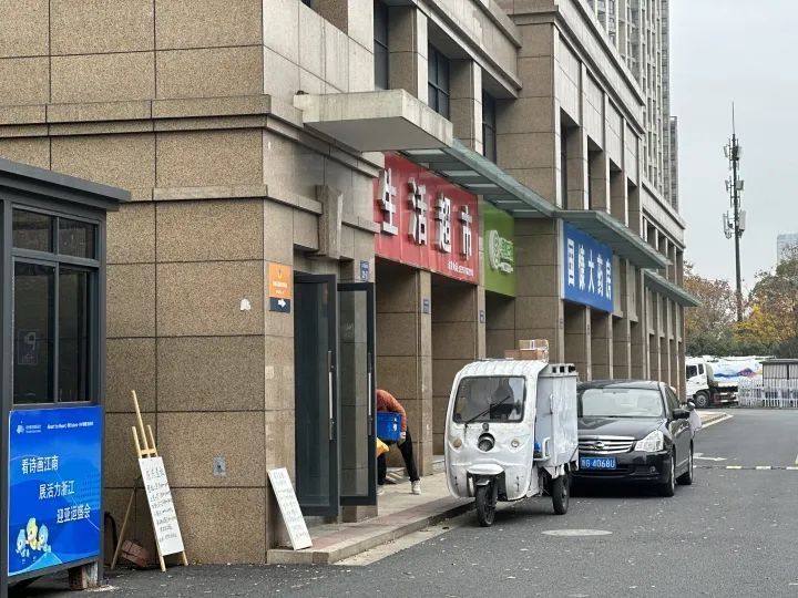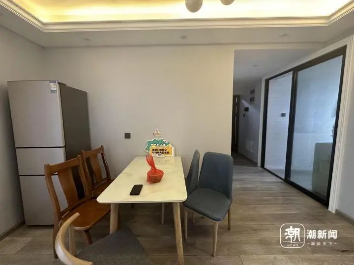 小家分为四个房间,一个公共厨房,2个卫生间,客厅里放着冰箱、餐桌必需品,房间内床、桌、橱柜一应俱全,阳台升降晾衣杆能晾晒日常衣物,楼下是生活超市、国慷大药房、健身房,大门口悬挂了护佑童馨·邻安小家标识,电梯里是社区老年食堂开业通知。