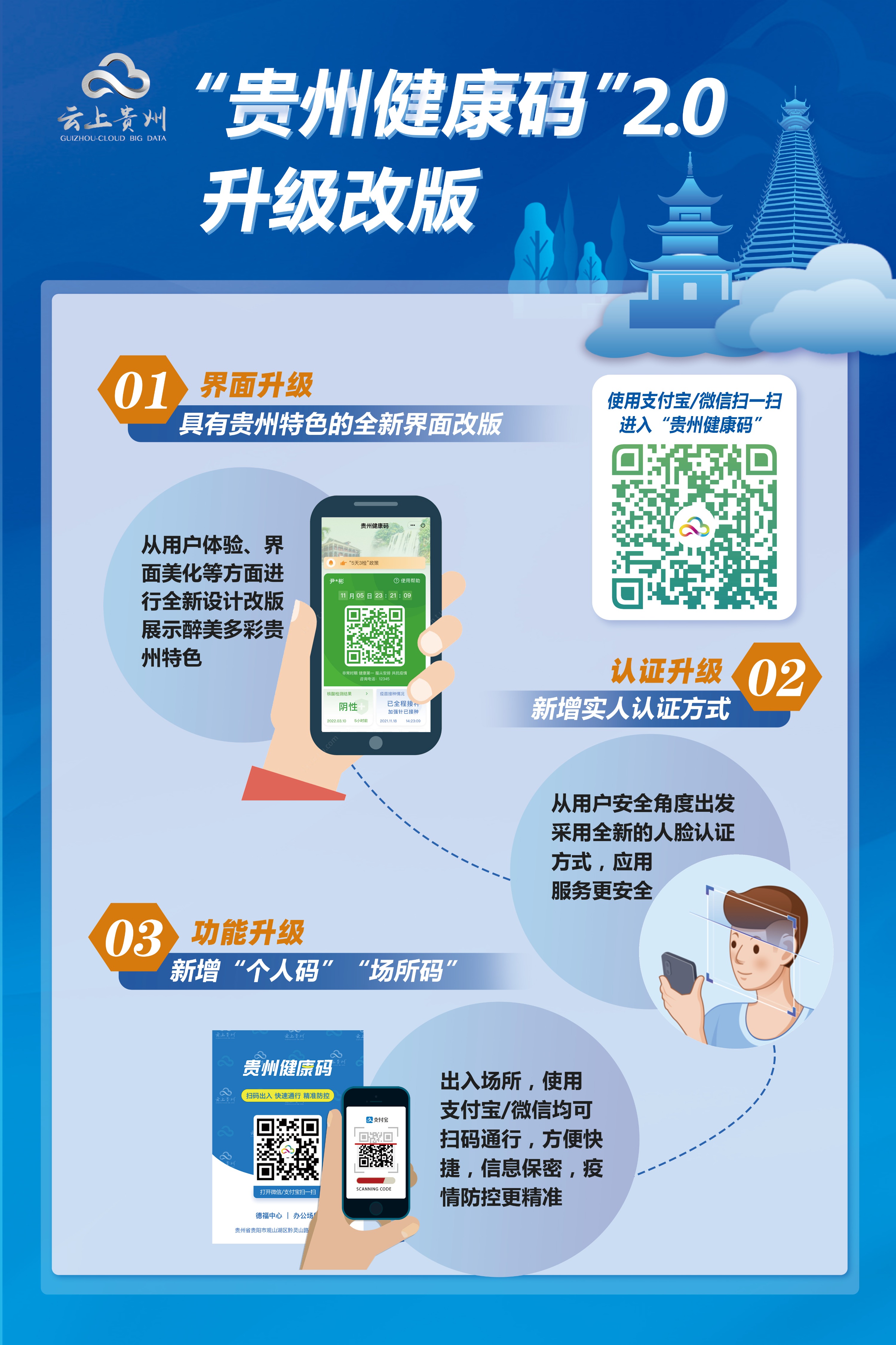 贵州健康码2.0重大功能升级。从落实“精准防控”的角度出发,健康码2.0主要完成了场所码应用、实名认证扫码、终端设备融合等功能升级。场所码作为出入场所的“电子登记簿”,可为相关场所生成一个专有二维码,标识该场所位置、场所名称等信息,由场所码申领方打印张贴,群众主动扫码实现自动登记留痕,并在群众手机端显示相应通行建议。