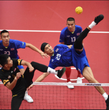 藤球是一项运用脚腕、膝关节等部位同时夹、顶球,不让球落地的运动,类似我国民间的踢花毽子。藤球跟排球比赛有些类似,所不同的是以脚代手,所以又叫“脚踢的排球”。在新德里1982年第9届亚运会,藤球作为表演项目亮相,在北京1990年第11届亚运会上,藤球成为正式比赛项目。藤球场地长13.4米,宽6.1米,场地上空8米内,场地四周3米内不得有障碍物。球场中线处有球网,网高不低于1.52米(女子1.42米)。球为圆形空心球,用天然藤条或塑料条编成。