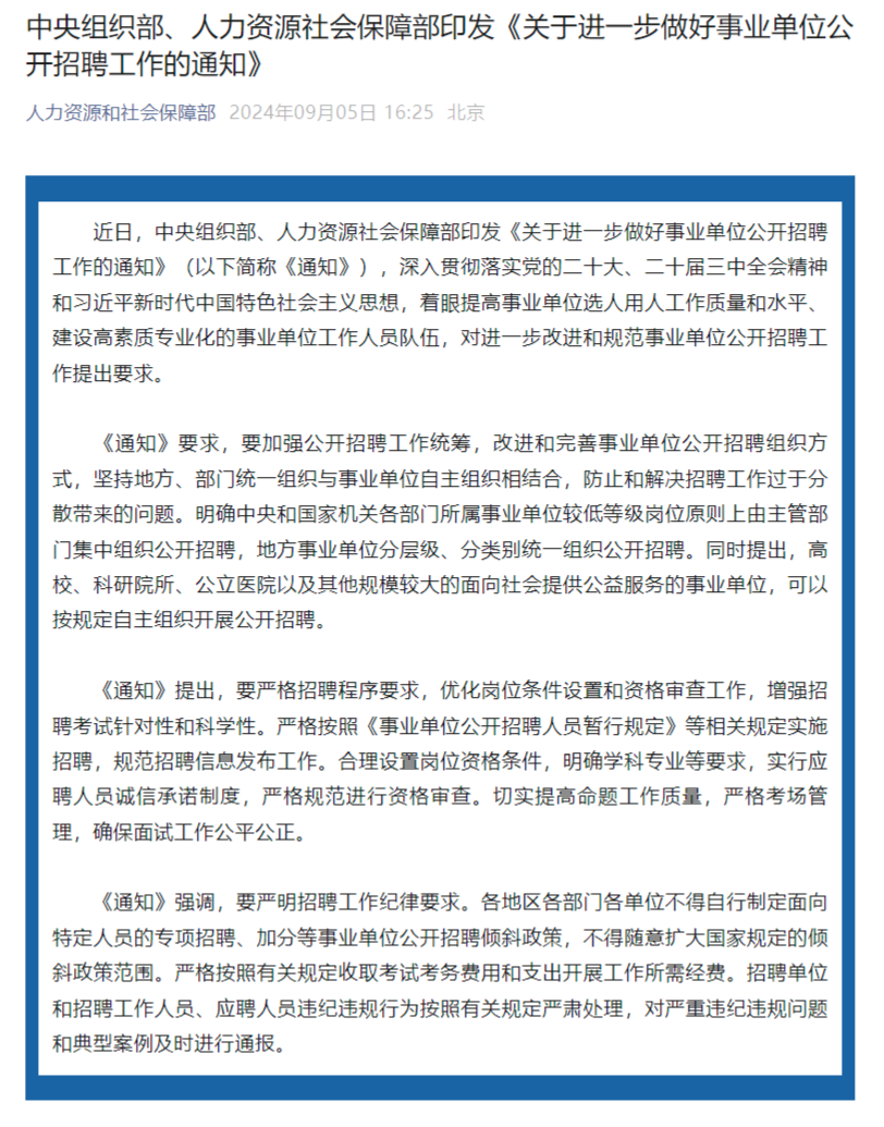 近日,中央组织部、人力资源社会保障部印发《关于进一步做好事业单位公开招聘工作的通知》(以下简称《通知》),深入贯彻落实党的二十大、二十届三中全会精神和习近平新时代中国特色社会主义思想,着眼提高事业单位选人用人工作质量和水平、建设高素质专业化的事业单位工作人员队伍,对进一步改进和规范事业单位公开招聘工作提出要求。