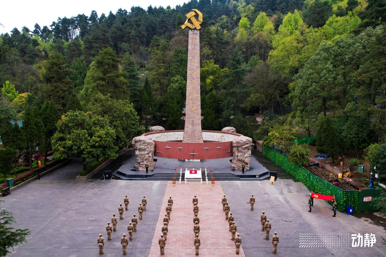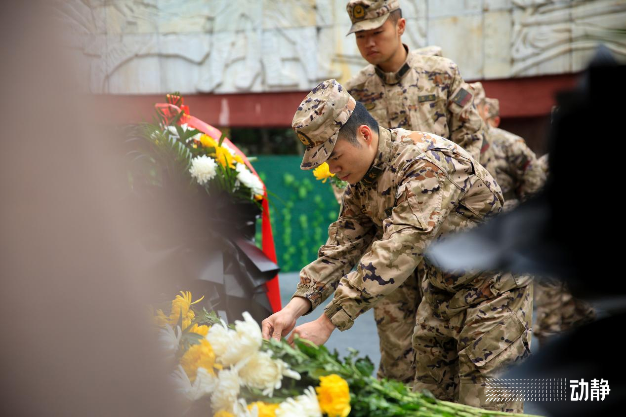 在红军山烈士陵园,武警遵义支队官兵整齐列队,肃穆而立,向革命先烈敬献花篮、扶理挽联、鞠躬默哀。