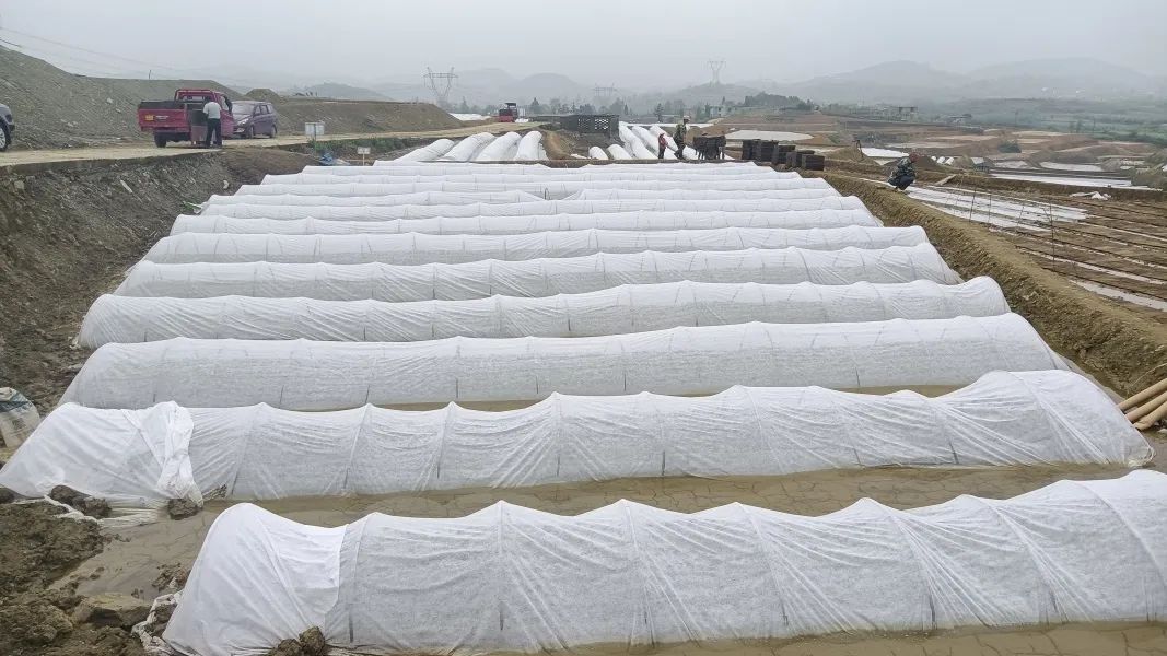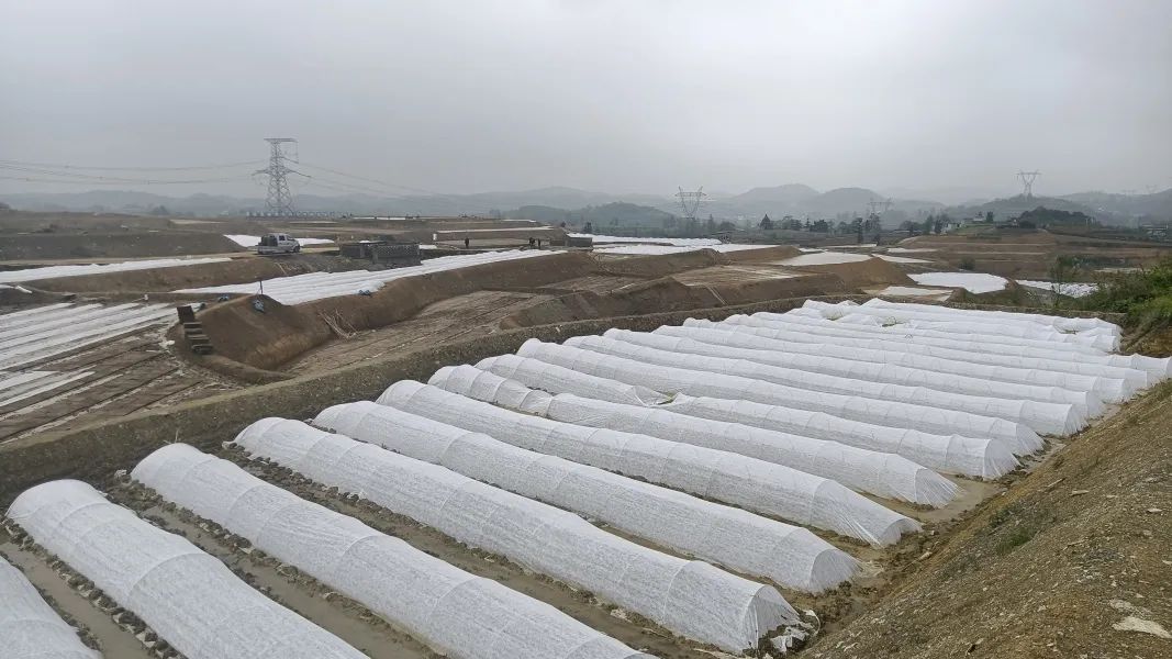 播种现场,机械在忙碌运转,育秧盘下田工作也有条不紊同步进行。拱棚之间的空缺田块,不少产业工人正忙着运送、摆放育秧盘,并为一行行育秧盘覆盖上无纺布、搭建小拱棚,好一幅繁忙的春耕图景!