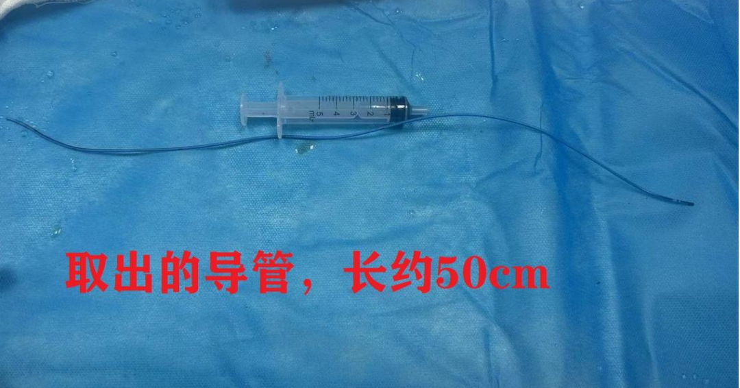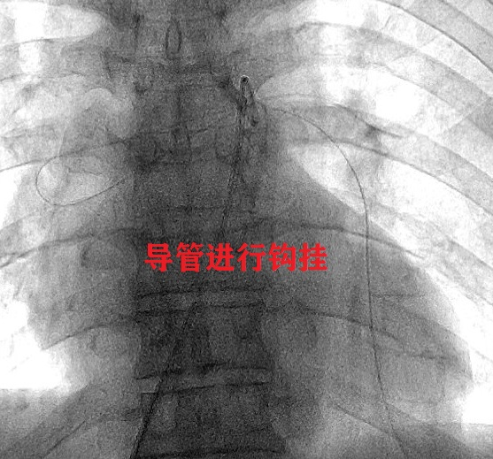 由于该导管两头均在血管分支远端,无法单纯利用圈套器进行套取。针对这一手术难点,介入医生选择在X线透视下,利用造影导管对异物进行反复钩挂。经过1个多小时的努力,终于将异物一端从上肺静脉内挑拨到了肺动脉主干内,并利用圈套器成功取出了全部脱落的长约50cm的PICC导管,取出后造影未发现明显血管损伤,目前患者状态稳定。