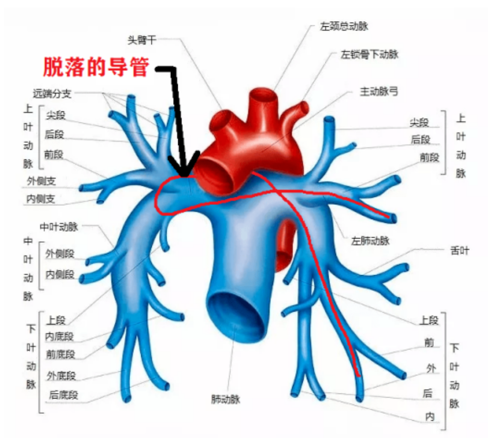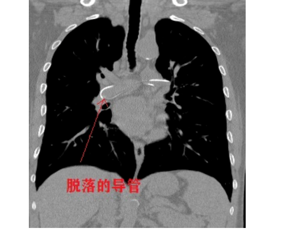 一名来自贵州施秉的59岁男性患者,4个月前因患白血病开始行PICC置管输液化疗,且长期于外院进行化疗及导管护理。近期该名患者到黔南州人民医院进行化疗,常规行胸部CT检查偶然发现其PICC导管出现断离并顺血流游走,经过心脏后卡在了肺动脉内。其一端在左上肺动脉,另一端在左下肺动脉,其余部分盘绕于肺动脉主干内。