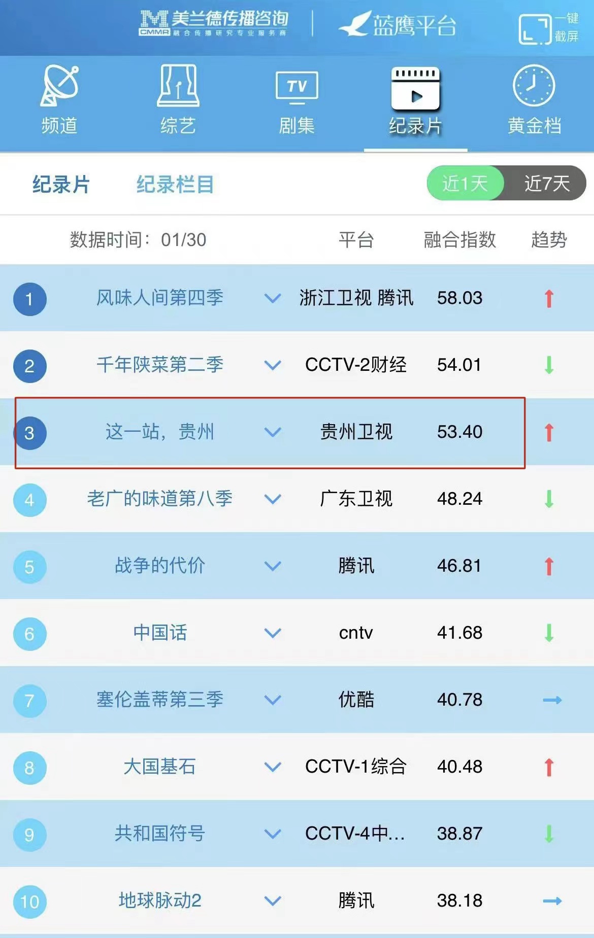 《这一站,贵州》自从开播以来,一直“常居”美兰德全国纪录片融合传播指数榜,第五期《桥》播出后,排名再进一步,冲进榜单前三位。