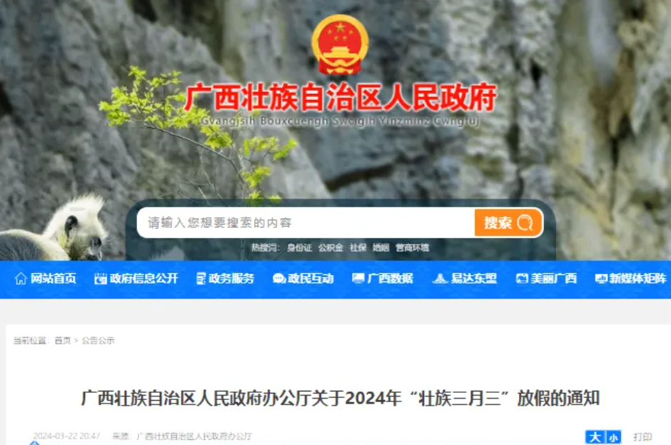 3月22日,广西壮族自治区人民政府办公厅发布《广西壮族自治区人民政府办公厅关于2024年“壮族三月三”放假的通知》。