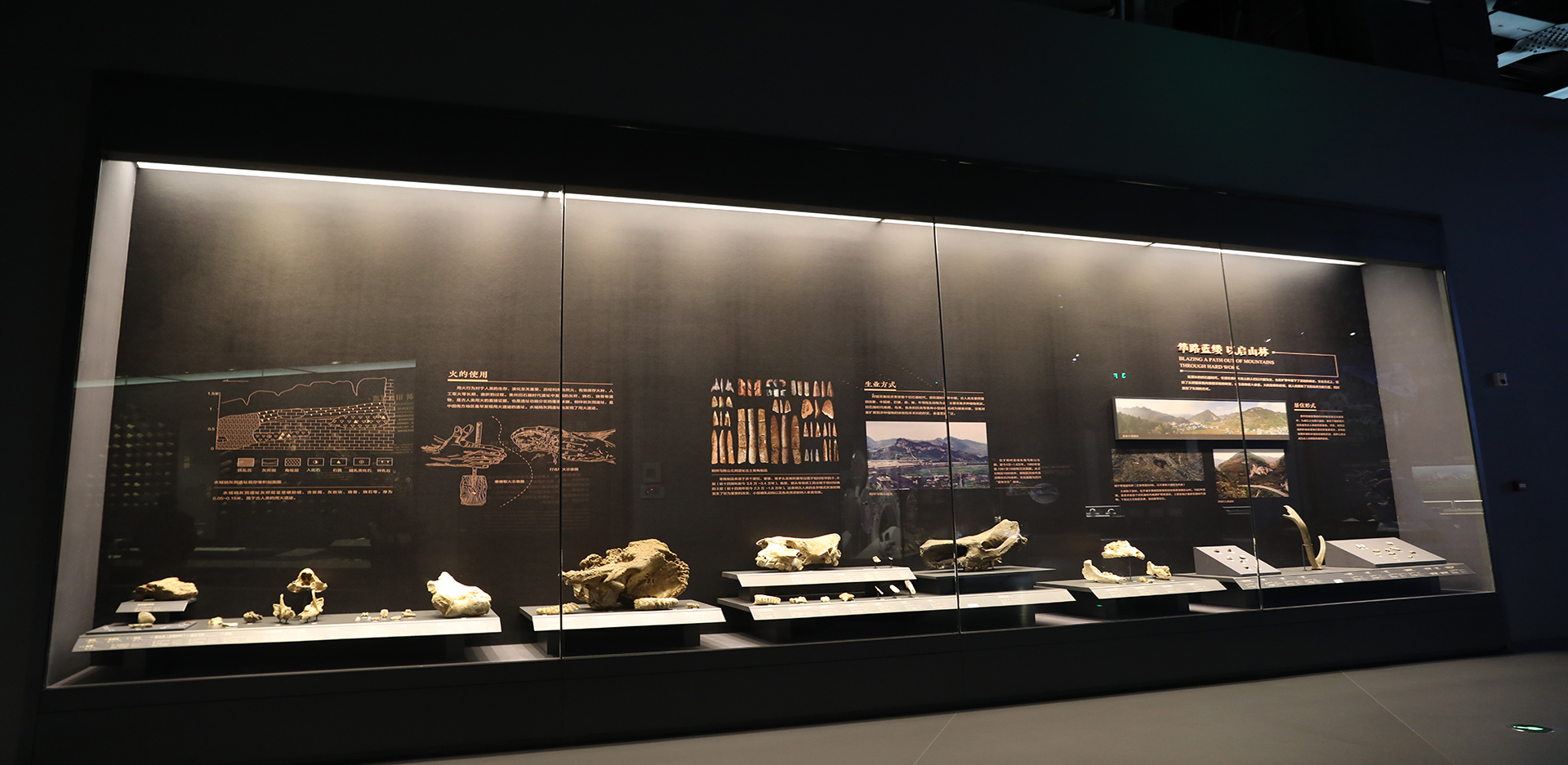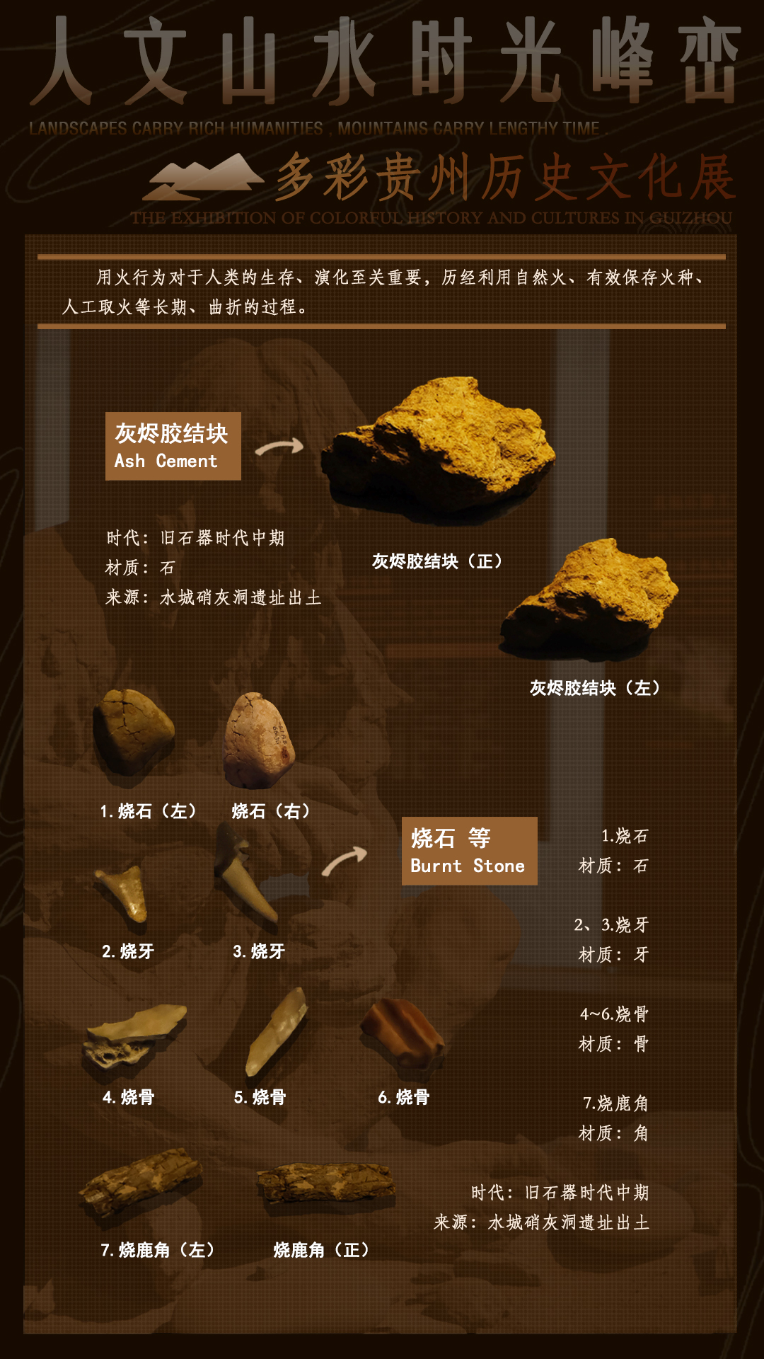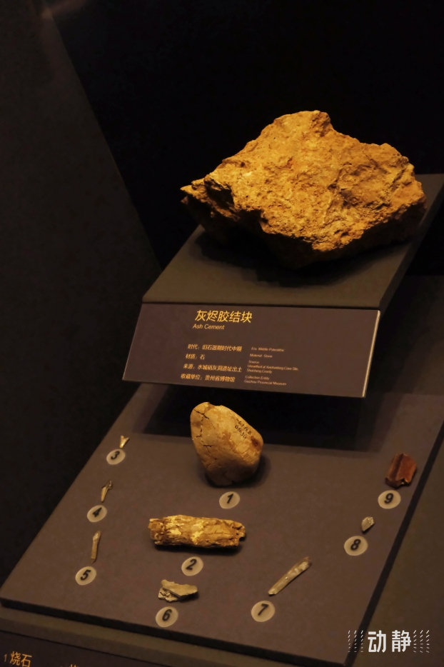 在“史前时期”的展厅中,我们可以看到许多贵州旧石器时代遗址中发现的灰烬、烧石、烧骨等遗物,这是古人类用火的直接证据,也是遗址功能分区的重要依据。