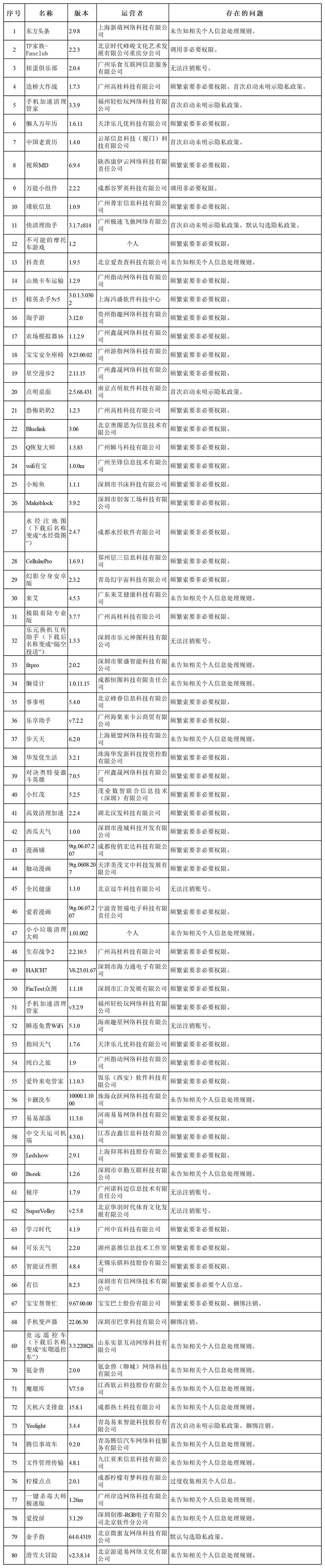 经查,“超凡清理管家”等55款App存在强制索要非必要权限、未经单独同意向第三方共享精确位置信息、无隐私政策、超范围收集上传通讯录等问题,违反《个人信息保护法》等法律法规规定,性质恶劣,依法予以下架处置;“东方头条”等80款App存在频繁索要非必要权限、首次启动未提示隐私政策、未告知相关个人信息处理规则、默认勾选隐私政策、无法或难以注销账号等问题,违反《个人信息保护法》等法律法规规定,依法责令限期1个月完成整改,逾期未完成整改的,依法予以下架处置。