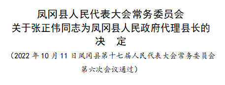 依据《中华人民共和国地方各级人民代表大会和地方各级人民政府组织法》和《贵州省各级人民代表大会常务委员会人事任免条例》的规定,凤冈县第十七届人民代表大会常务委员会第六次会议决定:张正伟同志为凤冈县人民政府代理县长。