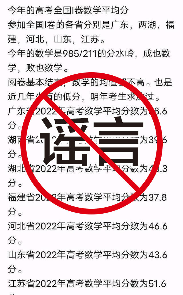 2022年高考尘埃落定,截至目前各省高考阅卷也基本完成。明起高考成绩即将陆续放榜,近日,有自媒体“抢先”发布福建、江苏、广东等地高考数学成绩平均分,并称“阅卷基本结束,数学的均值都不高,也是近几年少有的低分”。对此,江苏、福建、广东等多省辟谣,上述信息为假消息,他们从未公布各科平均分。