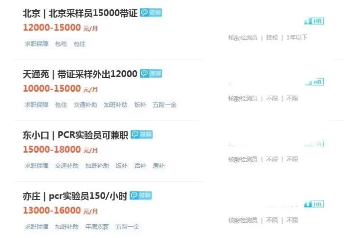 需求的快速增大还让核酸检测人员变得紧缺,在招聘平台上,可以搜索到大量有关“核酸检测员”“采样辅助员”“带护士证采样员”的招聘信息,发布招聘信息的有第三方检测机构、劳务公司、地方医疗机构等。