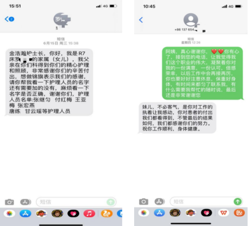 但通过她每日探视时间的观察和沟通,特别是多次亲眼看到护士像对待自己的亲人一样,完全没有嫌弃和不耐烦的表露。看到护士们一边温柔地向罗爷爷解释为什么会大便失禁,又一边认真地给罗爷爷擦洗的时候,那一刻罗女士的内心被医务人员认真细致的工作态度、真心热诚的责任心所感动,默默地将这些记在了心里。