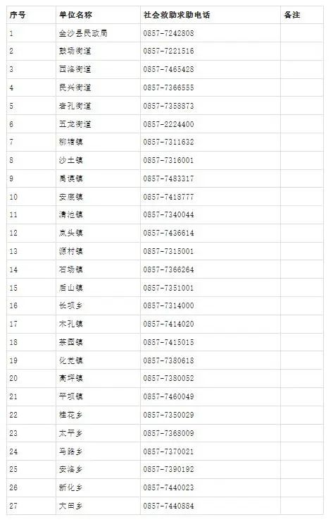 为确保疫情期间各类群众遭遇急难情形“求助有门”“受助及时”,毕节市金沙县现将县、乡镇(街道)社会救助求助电话公告如下: