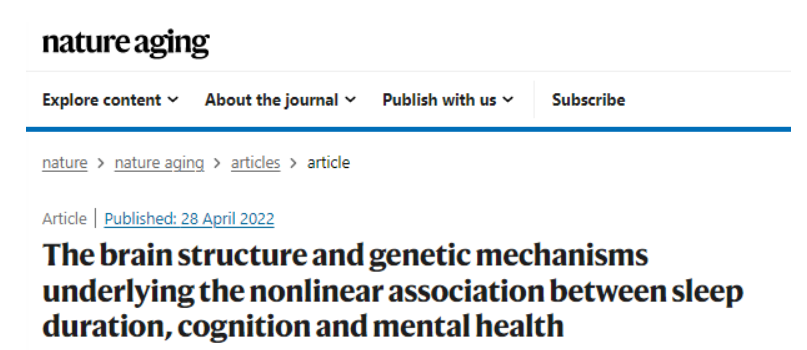 2022年4月28日,复旦大学冯建峰教授、程炜研究员领导的研究团队发表在《Nature Aging》上的一项新研究。该研究基于近50万人的数据发现,每天睡7小时是认知能力和心理健康的最佳睡眠时间。睡眠时间太短、太长都与认知能力受损有关,例如处理速度、视觉注意力、记忆力和解决问题的能力。