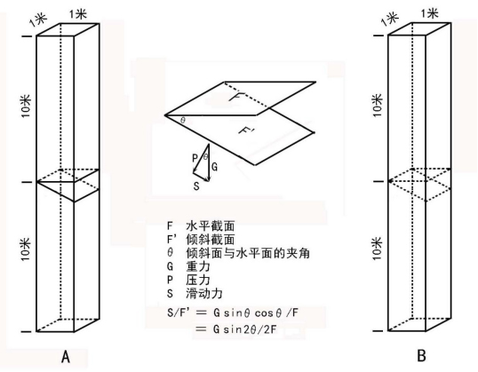 在《毕节化屋村刀削斧剁般的百丈悬崖是怎么形成的?》一文中,我们曾用一根20米高横截面1米见方的花岗岩四方石柱为例来分析岩石内部的受力情况(见图2)。通过分析,得知在距离柱子顶端10米处倾斜角为45°的斜截面上承受的剪应力最大,为每平方厘米1.5千克力。
