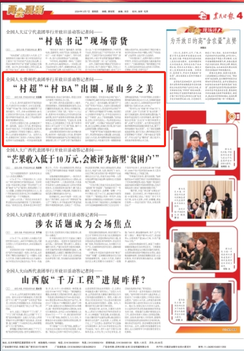 3月6日,贵州代表团举行开放团组会议,代表们针对乡村振兴、乡村文旅发展、“村超”“村BA”等三农热点问题回答了记者的提问。当天,共有65家媒体的128名记者参加开放日活动,代表们面对记者的提问声情并茂地作答,展示了两会期间多彩贵州的精神与自信。