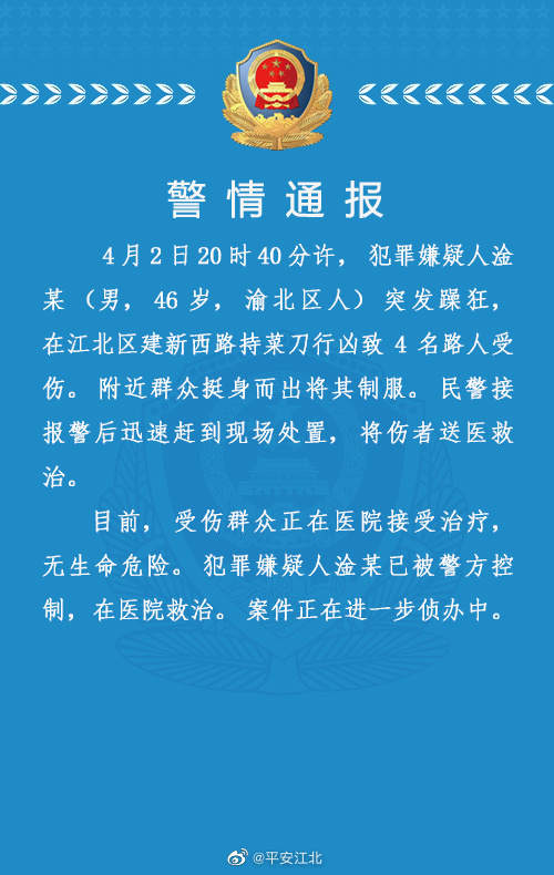 重庆市公安局江北区分局通报,4月2日20时40分许,犯罪嫌疑人淦某(男,46岁,渝北区人)突发躁狂,在江北区建新西路持菜刀行凶致4名路人受伤。附近群众挺身而出将其制服。民警接报警后迅速赶到现场处置,将伤者送医救治。