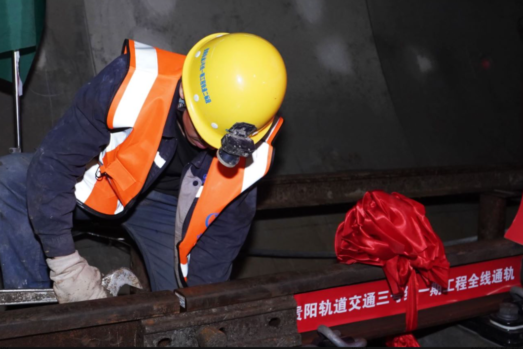 4月28日上午,在贵阳市花果园铺轨基地现场,随着最后一组25米轨排平稳就位,标志着贵阳轨道交通3号线一期全线轨通,为后续全线电通、热滑、动车调试等关键工作提供了施工条件,为通车迈出坚实的一步。