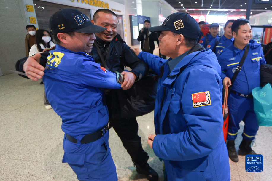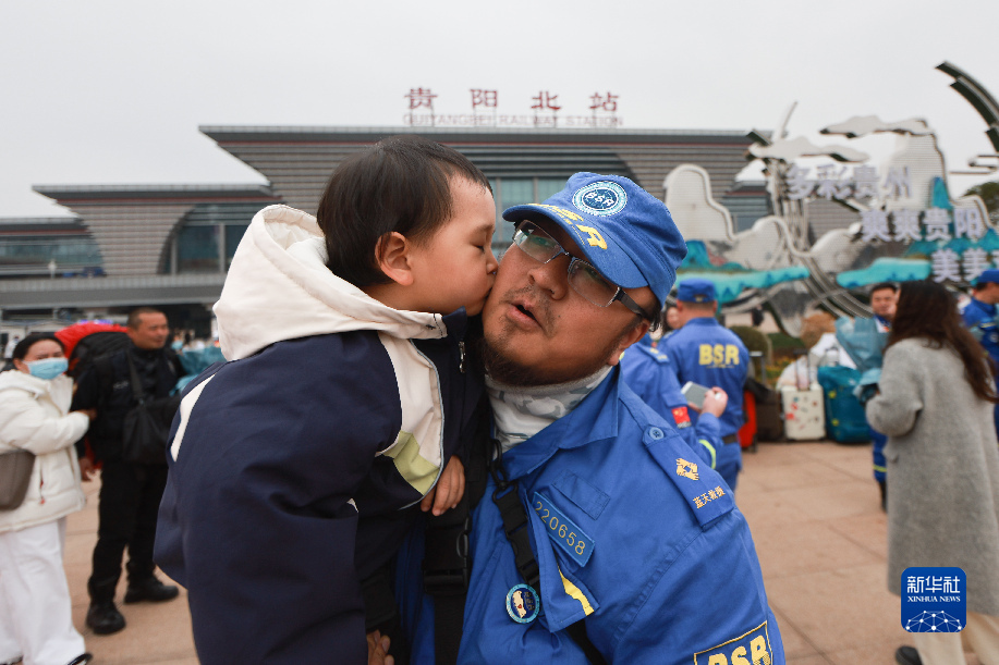 当日,13名赴土耳其参与地震救援的贵州蓝天救援队队员回到贵州省贵阳市,当地队友和亲戚朋友等在贵阳北站迎接他们归来。