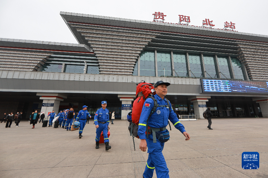 2月20日,归来的贵州蓝天救援队队员走出贵阳北站。新华社记者 刘续 摄