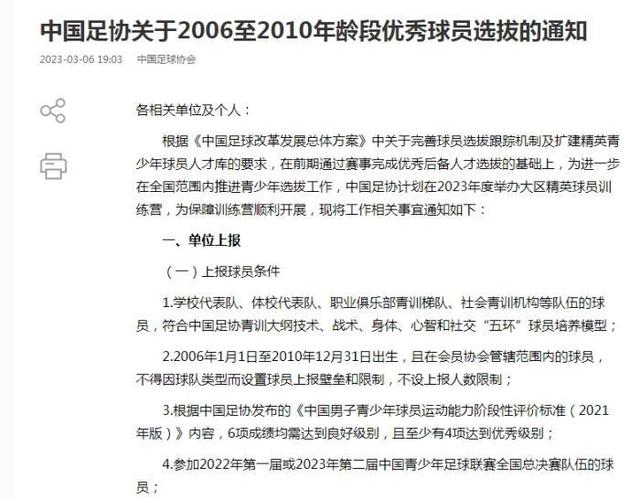 中国足球协会日前在网站发布关于2006至2010年龄段优秀球员选拔的通知。其中提到,为进一步在全国范围内推进青少年选拔工作,中国足协计划在2023年度举办大区精英球员训练营,选拔方式包括单位上报和个人自荐两种。