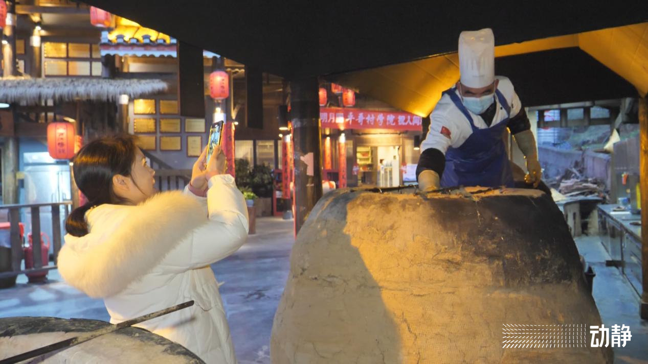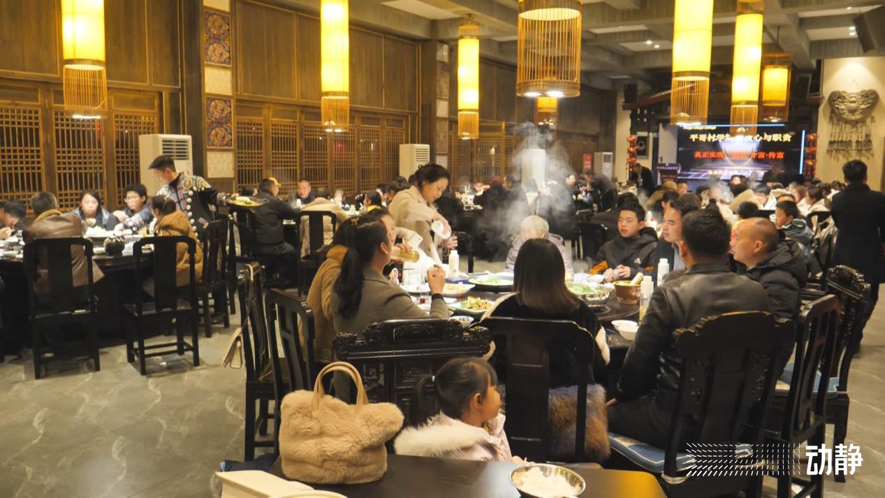 “包房18桌,大厅16桌。差不多订满了。”杨丽萍笑盈盈地介绍。尽管天气阴冷,灯火通明的餐厅依然温暖。店外,高悬的红色灯笼平添了几分节日喜庆,厨师在土灶前忙得不亦乐乎;店内,食客们在火锅升腾的热气间交杯换盏,享受着相聚时光。