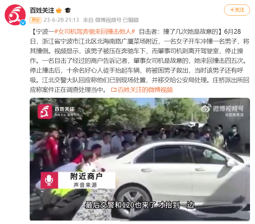 据媒体报道,6月28日,浙江省宁波市江北区北海南路广厦菜场附近,一名女子开车冲撞一名男子,将其撞倒。视频显示,该男子被压在奔驰车下,而肇事司机则离开驾驶室,停止操作。一名目击了经过的商户告诉记者,肇事女司机是故意的,她来回撞击四五次。停止撞击后,十余名好心人徒手抬起车量,将被困男子救出,当时该男子还有呼吸。江北交警大队回应称他们已到现场处置,并移交给公安局处理。庄桥派出所回应称案件正在调查处理当中。