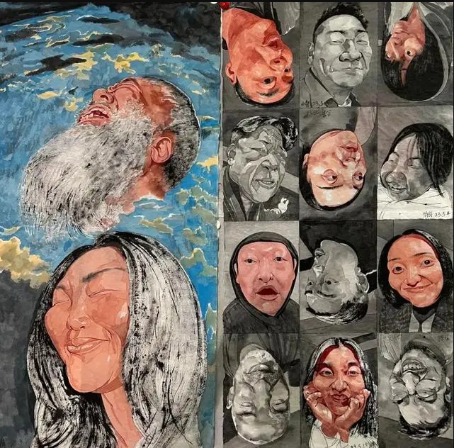 《朋友》 方力钧 水墨纸本(贵州土纸)设色 140×140cm 2023年