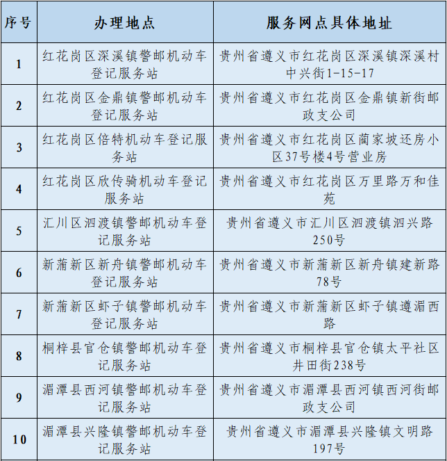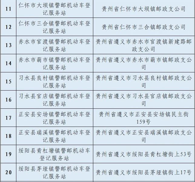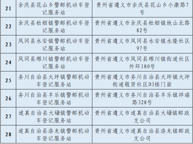 记者从遵义市公安交通管理局了解到,为最大限度满足群众上牌登记需求,遵义市公安交通管理局积极指导邮政机构及摩托车销售企业设立机动车登记服务站,在全市新增28个摩托车上牌网点,全面实现摩托车上牌登记就近办、便捷办、一次办。新增的28个摩托车登记上牌网点如下: