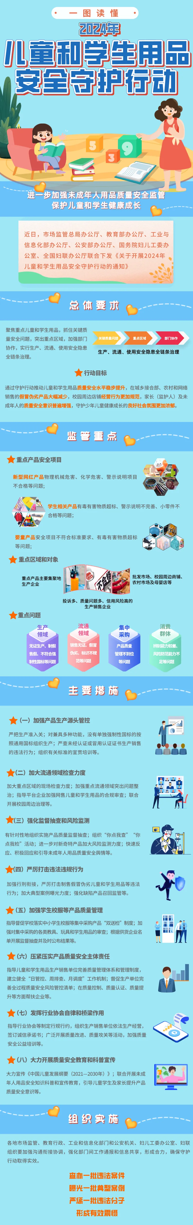 本次守护行动聚焦重点儿童和学生用品,抓住关键质量安全问题,突出重点区域,加强部门协作,实行生产、流通、使用安全隐患全链条治理。守护行动将针对新型网红产品、学生相关产品、婴童产品等重点儿童和学生用品,突出主要聚集地生产企业,校园周边、城乡接合部、农村市场儿童和学生用品经营者,多次发现质量安全问题的生产销售企业,着力解决生产、流通领域产品质量安全问题,全面加强学校等采购部门质量管理,大力增强家长和未成年人群体安全意识和风险防范能力。