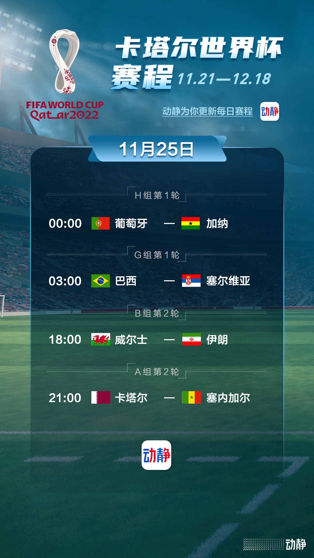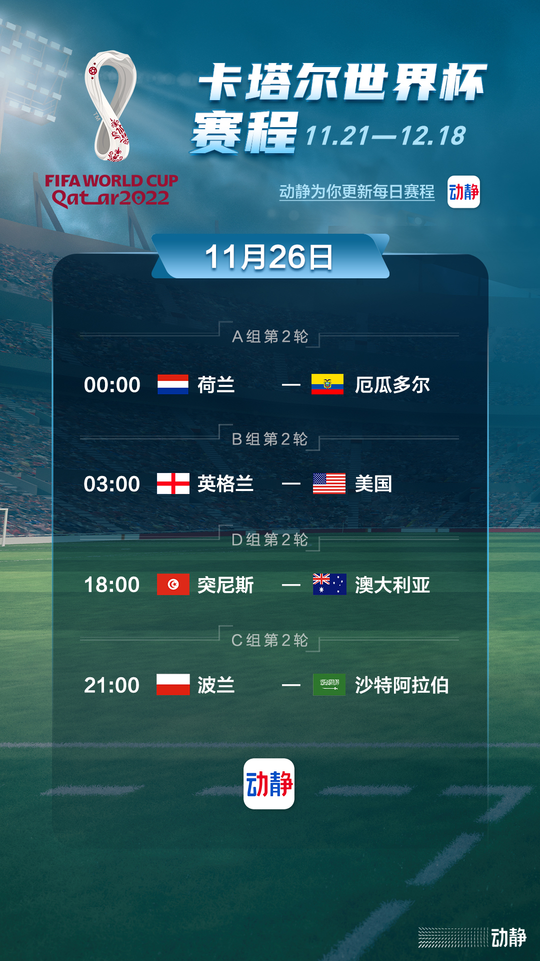 北京时间11月25日18点,世界杯B组第2轮威尔士队对阵伊朗队,25日21时,A组第2轮卡塔尔队对阵塞内加尔队;26日凌晨0时,A组第2轮荷兰队对阵厄瓜多尔队;26日凌晨3时,B组第2轮英格兰队对阵美国队;26日18时,D组第2轮突尼斯队对阵澳大利亚队;26日21时,C组第2轮波兰队对阵沙特阿拉伯队。