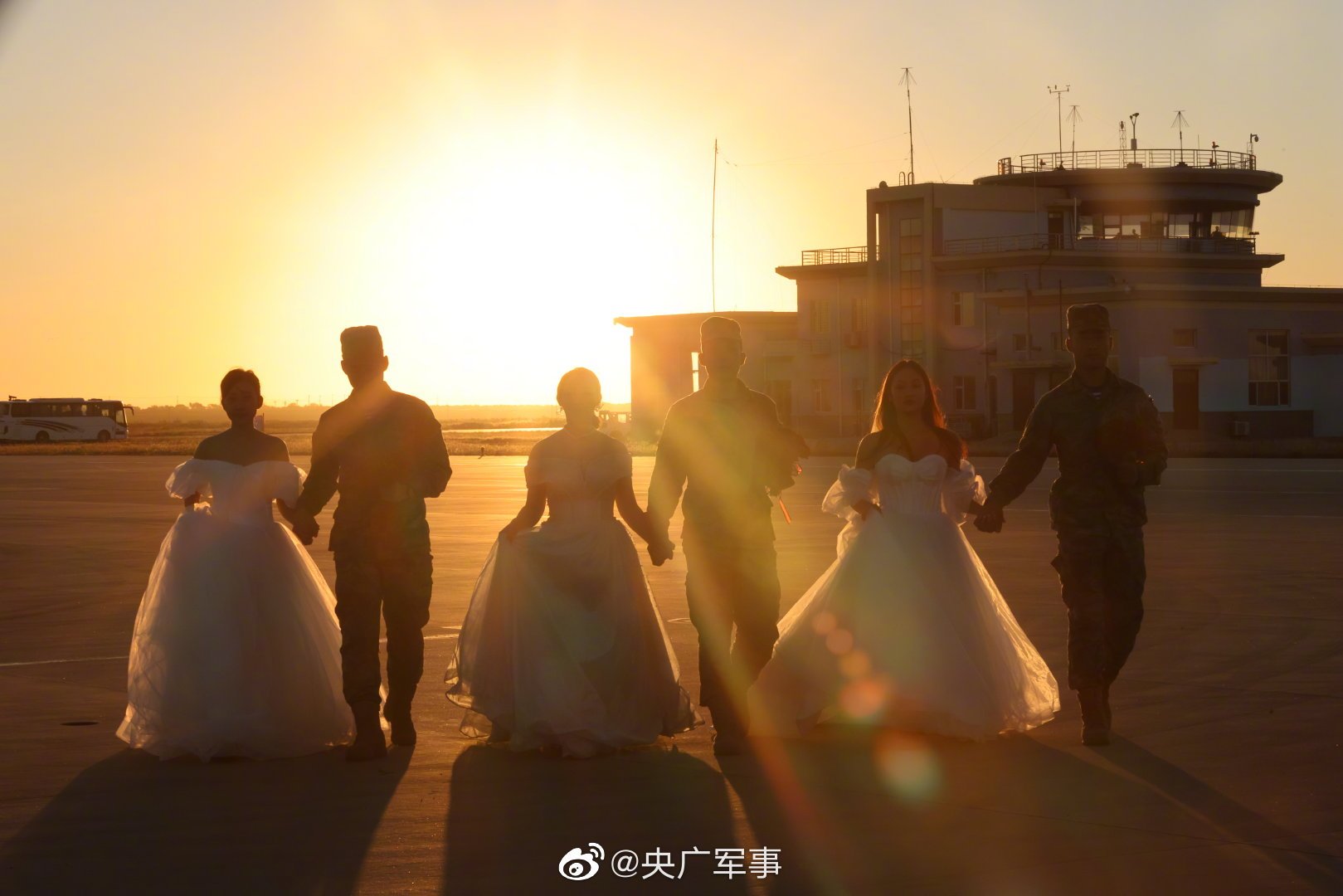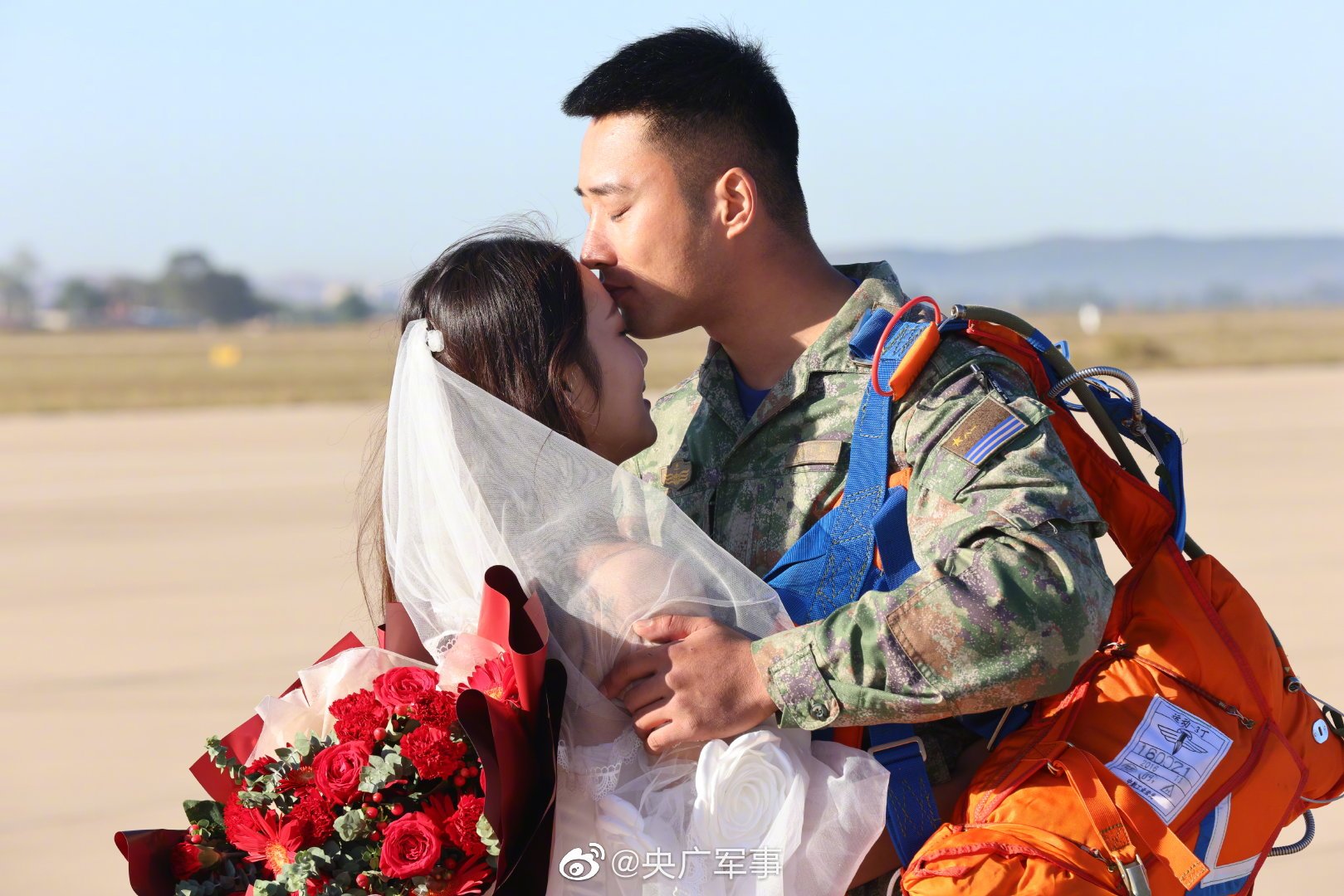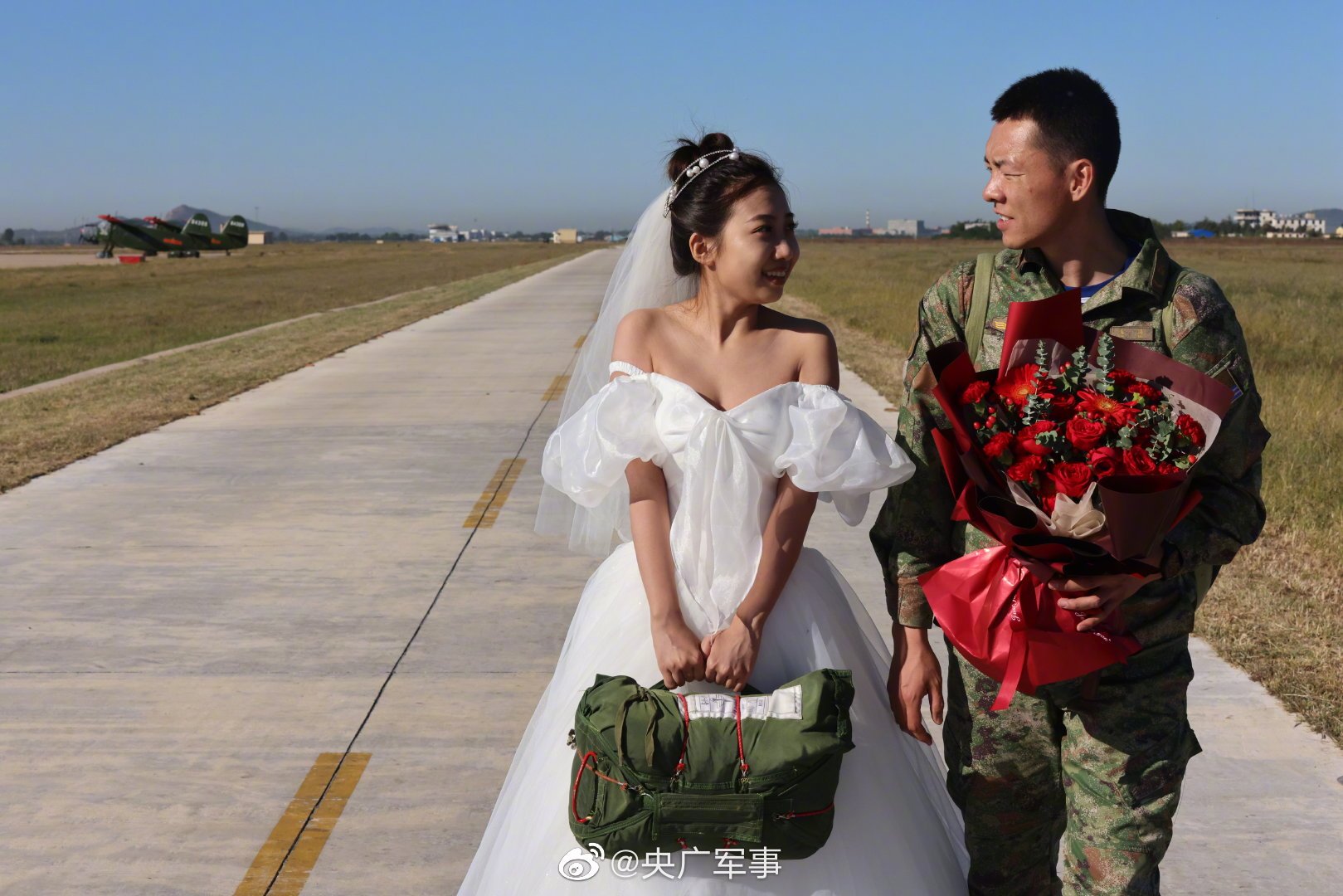 “我的意中人是个海军航空兵,有一天他会脚踩七彩祥云来娶我!”新娘手捧鲜花,期盼心中英雄;新郎身背降落伞,从千米高空降落到新娘身边。小编已经被这场特别的集体婚礼甜哭了!一定要幸福。