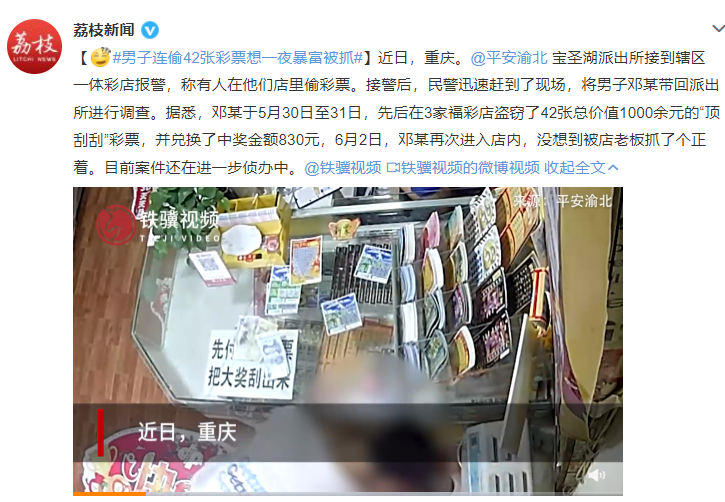 近日,重庆。宝圣湖派出所接到辖区一体彩店报警,称有人在他们店里偷彩票。接警后,民警迅速赶到了现场,将男子邓某带回派出所进行调查。据悉,邓某于5月30日至31日,先后在3家福彩店盗窃了42张总价值1000余元的“顶刮刮”彩票,并兑换了中奖金额830元,6月2日,邓某再次进入店内,没想到被店老板抓了个正着。目前案件还在进一步侦办中。