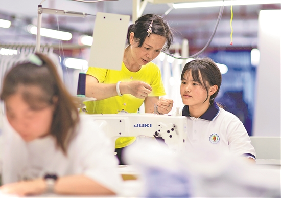 6月25日,贵州省铜仁市玉屏侗族自治县中等职业学校服装设计专业的学生在服装生产企业学习加工服装。近年来,该校不断深化与东西部协作企业合作,采取“产教融合”“工学结合”等教学方式,培养企业急需的职业人才。