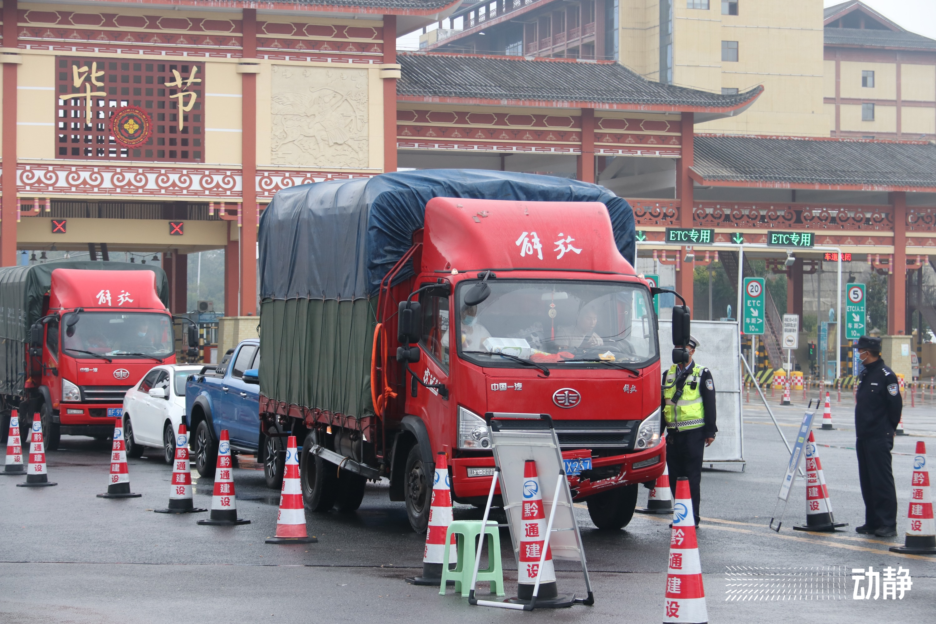 一大早,天空飘着绵绵秋雨。在杭瑞高速毕节收费站,广大交警、特巡警、政府工作人员和医务人员等在防疫岗位上紧张忙碌着,过往的车辆从高速收费站不断进进出出,卡点上的防疫工作人员有序引导着车辆人员进行扫码、信息登记及核酸检测等疫情防控工作,不漏一车、不落一人,严防死守,确保安全“过关”。对于这样的工作流程,每时每刻都要反复做,但他们已经习以为常,并无抱怨。