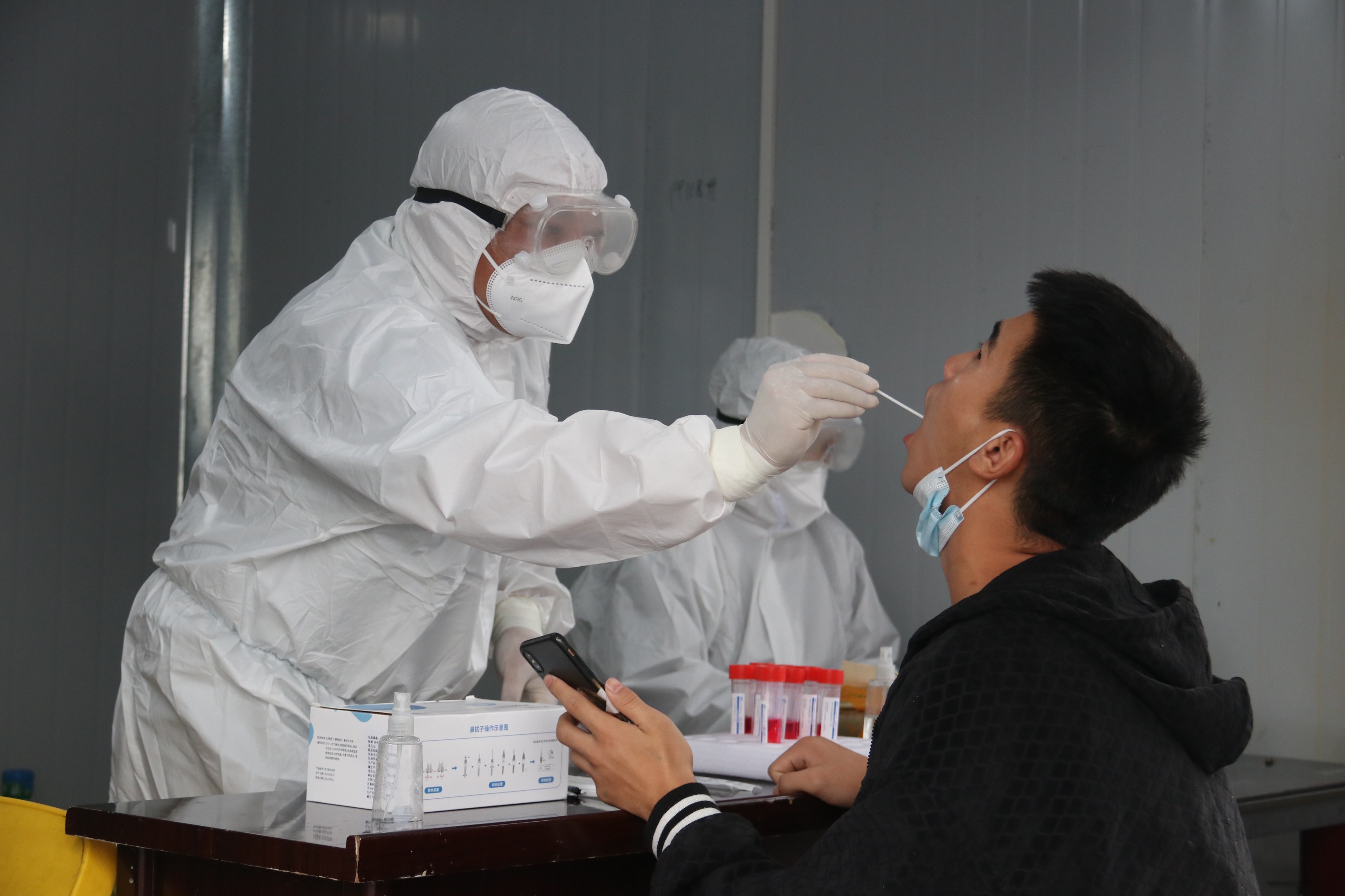防疫工作人员武勇在采集核酸样本