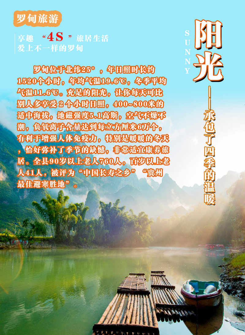 在罗甸,充足的阳光,让你每天可比别人多享受2个小时日照,400至800米的适中海拔,地磁强度5.1高斯,空气不燥不潮,负氧离子含量达到每立方厘米6万个,有利于增强人体免疫力,特别是暖暖的冬天,非常适宜康养旅居。全县90岁以上老人760人,百岁以上老人41人,被评为“中国长寿之乡”“贵州最佳避寒胜地”。