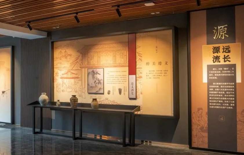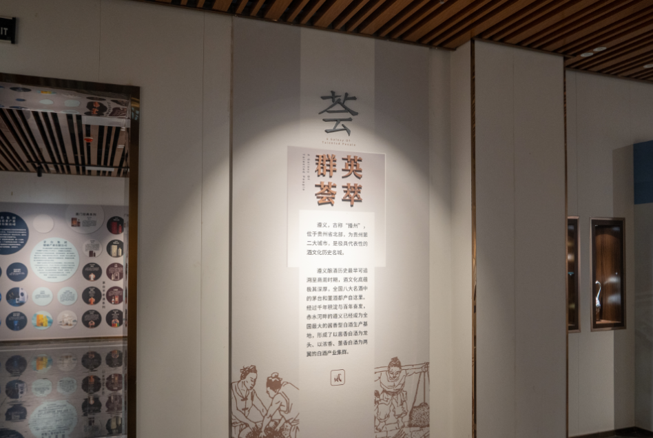 荟聚厅主要展示遵义的白酒产业发展现状及未来规划,同时展示了22家遵义本地主要白酒企业文化及其产品。