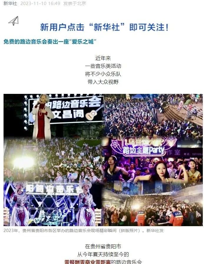 11月10日,新华社微信公众号刊发文章,点赞零报酬零商业零距离的贵阳路边音乐会为许多热爱音乐的草根乐队提供了舞台,逐渐成为群众的精神文化供给,也为城市发展增添了活力。