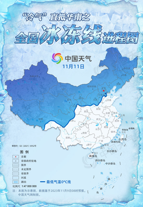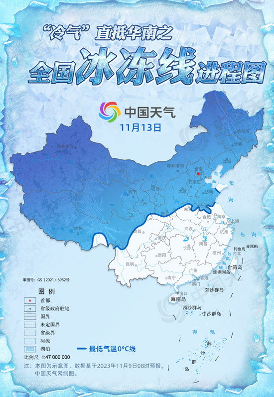 中国天气网讯 “从清晨到日暮,冷得朝朝暮暮。”11月10日起至13日,一股新的冷空气又将大举南下横扫我国中东部地区,并翻过南岭直抵华南,气温创新低浪潮将席卷大江南北。届时北方冷上加冷,冰冻线将推进到下半年来最南端,冰冻范围或覆盖我国近六成国土。中国天气网推出全国冰冻线进程图,看你家何时被“冻”。