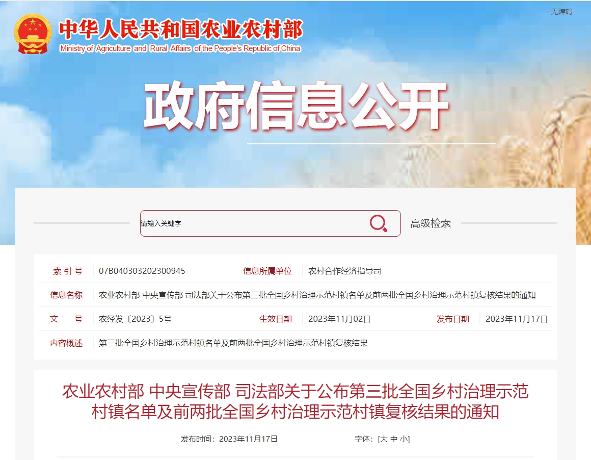 点击文字查看原文:农业农村部 中央宣传部 司法部关于公布第三批全国乡村治理示范村镇名单及前两批全国乡村治理示范村镇复核结果的通知