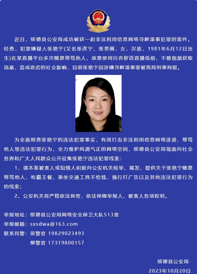 为全面彻查张艳宁的违法犯罪事实,有效打击非法利用信息网络诽谤、辱骂他人等违法犯罪行为,全力维护风清气正的网络空间,绥德县公安局现面向社会各界和广大人民群众公开征集张艳宁违法犯罪线索: