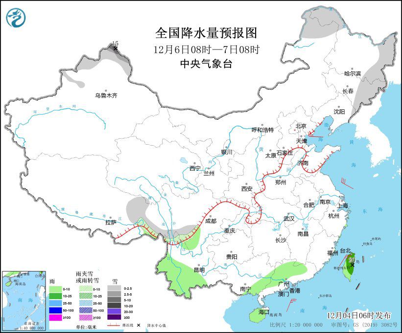 12月4日08时至5日08时,新疆北部、甘肃河西、青海南部、西藏中东部和南部、川西高原北部等地部分地区有小到中雪或雨夹雪,其中,新疆阿勒泰山区和伊犁河谷、西藏南部等地部分地区有大到暴雪,局地大暴雪(20~22毫米)。湖南南部、江西南部、浙江大部、福建、广东东部和北部、广西西部、云南南部、海南岛、台湾岛等地部分地区有小到中雨,其中,台湾岛中南部等地部分地区有大雨(25~40毫米)。新疆北疆北部、内蒙古大部、甘肃河西等地部分地区有4~6级风。