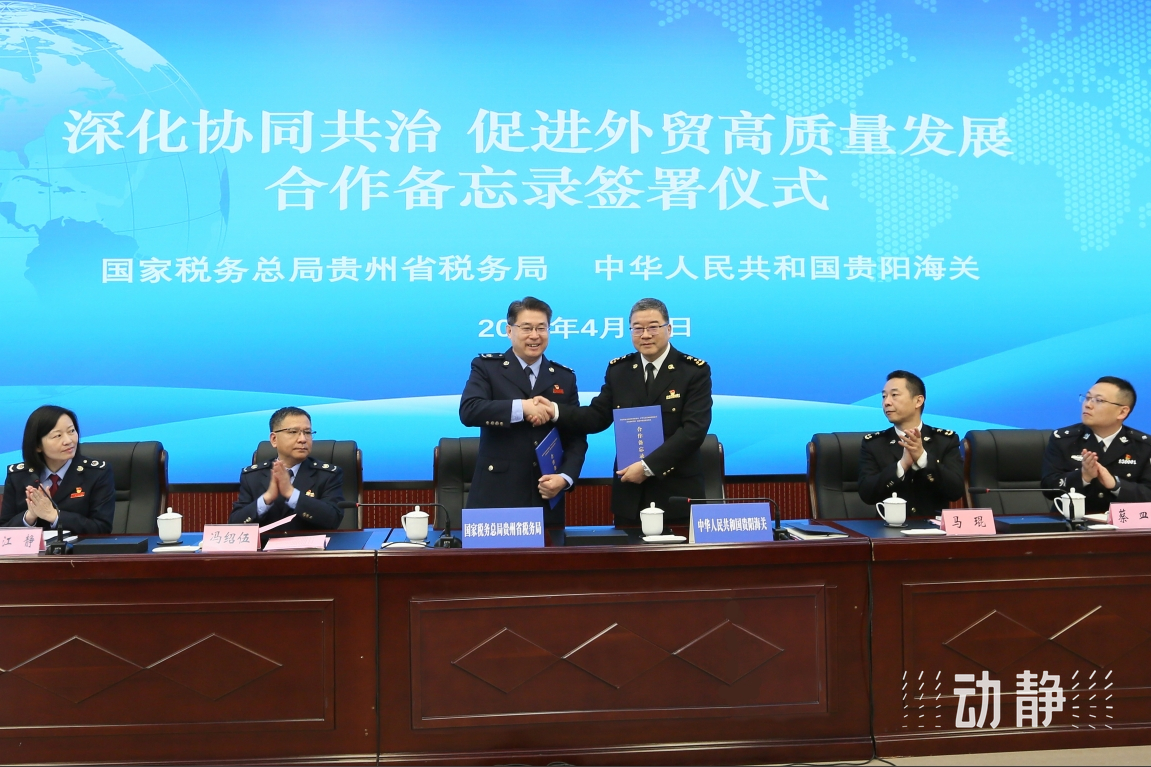 4月26日,贵州省税务局、贵阳海关签署《深化协同共治 促进外贸高质量发展合作备忘录》,共同营造市场化法治化国际化营商环境,助推贵州高水平开放和外贸高质量发展。