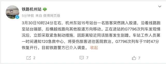 3月30日10时24分左右,杭州东站15号站台一名旅客突然跳入股道,沿着线路跑至站台端部,后横越线路向其他股道方向移动。正在进站的G7796次列车发现情况后,立即采取紧急制动措施,因距离较近同该旅客发生刮蹭。车站工作人员第一时间通知120急救中心,将受伤旅客送往医院救治。G7796次列车于11时47分恢复开行。目前铁路警方已介入调查。