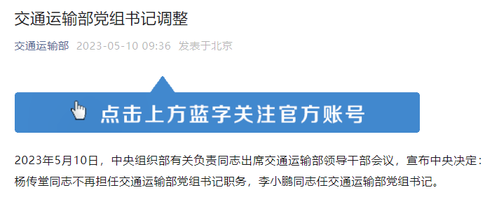 据交通运输部微信公众号10日消息,2023年5月10日,中央组织部有关负责同志出席交通运输部领导干部会议,宣布中央决定:杨传堂同志不再担任交通运输部党组书记职务,李小鹏同志任交通运输部党组书记。