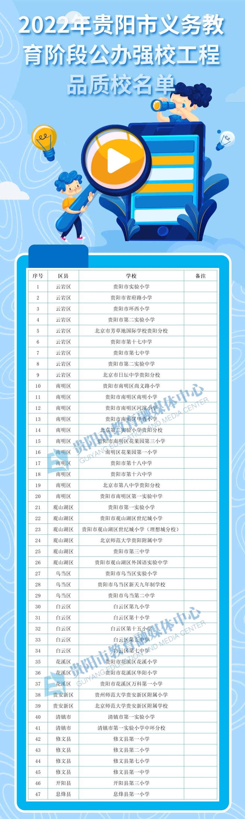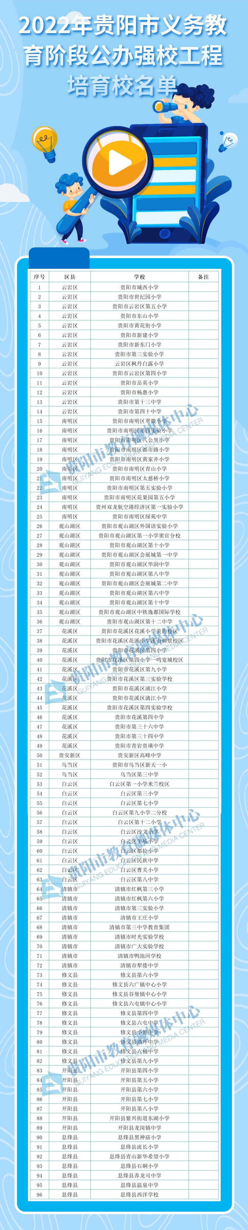 5月5日,贵阳市教育局公布了2022年贵阳市义务教育阶段公办强校工程项目校名单。