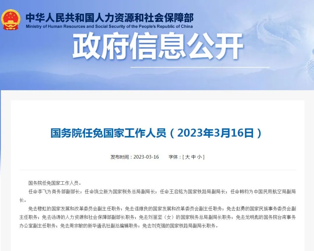 据人社部网站3月16日消息,国务院任免国家工作人员。