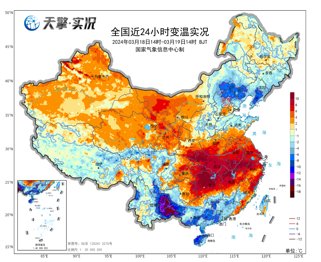 在阳光的加持下,长江中下游一带是今天升温最显著的区域。相比昨天同时次,今天14时,上述大部地区气温回升6~12℃。